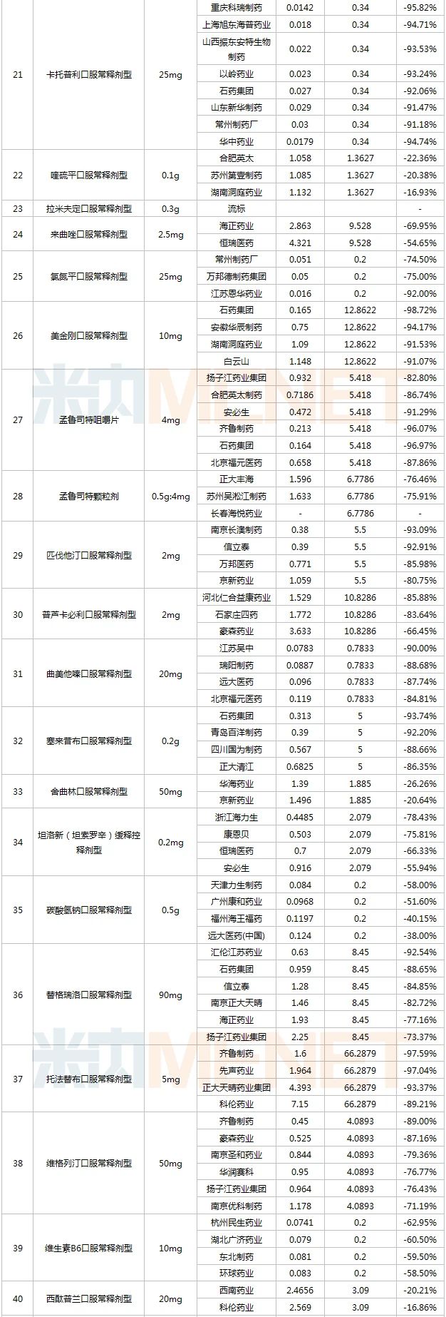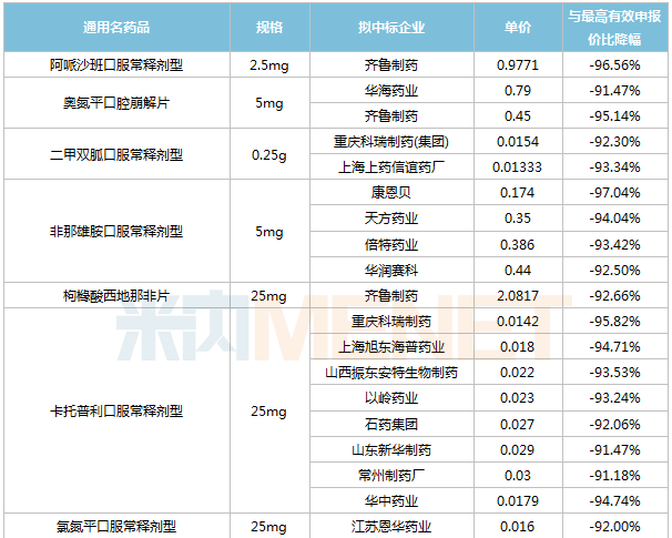 16個品種出現“大殺價”,降幅超過90%,其中齊魯的阿哌沙班、康恩貝的非那雄胺、重慶科瑞制藥的卡托普利、石藥及齊魯的美金剛、齊魯及先聲的托法替布降幅超過95%。