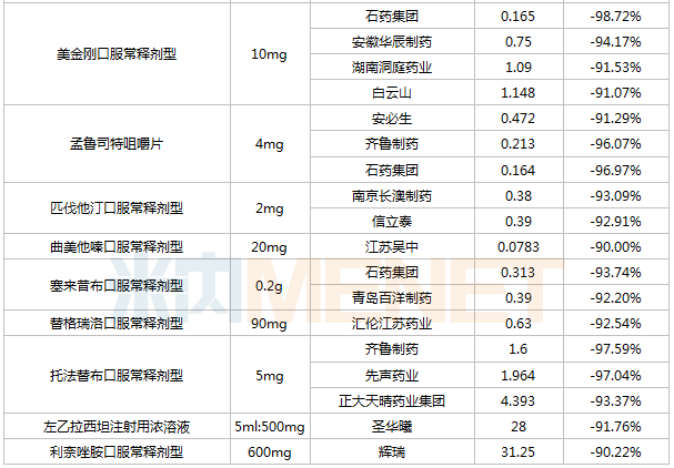 降幅超過90%的品種(單位:元/片、瓶、粒)